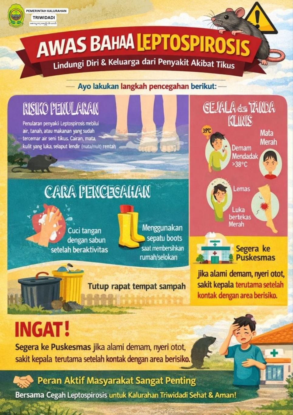 Triwidadi Info ( 12/01). Pemerintah Kalurahan Triwidadi mendukung penuh langkah Pemerintah Kabupaten Bantul dalam upaya kesiapsiagaan mengantisipasi peningkatan kasus Leptospirosis sebagaimana tertuang dalam Surat Edaran Sekretaris Daerah Kabupaten Bantul Nomor B/400.7.1/00048/DINKES tertanggal 5 Januari 2026.