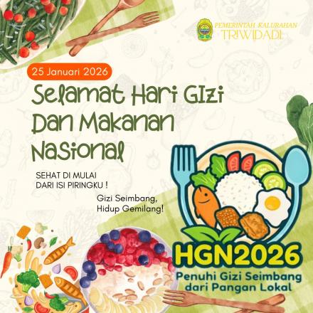 Triwidadi Info (25/01). Dalam rangka memperingati Hari Gizi Nasional (HGN) yang jatuh pada tanggal 25 Januari 2026, masyarakat diajak untuk semakin meningkatkan kesadaran akan pentingnya gizi seimbang sebagai fondasi utama kesehatan. Tahun ini, Hari Gizi Nasional mengusung tema “Penuhi Gizi Seimbang dari Pangan Lokal” dengan slogan “Sehat Dimulai dari Piringku”.