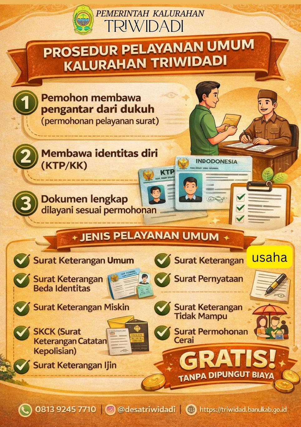 Triwidadi Info (30/01). Pemerintah Kalurahan Triwidadi terus berkomitmen memberikan pelayanan administrasi yang mudah, transparan, dan bebas biaya kepada masyarakat. Seluruh pelayanan umum dapat diakses dengan prosedur yang jelas serta persyaratan yang sederhana.