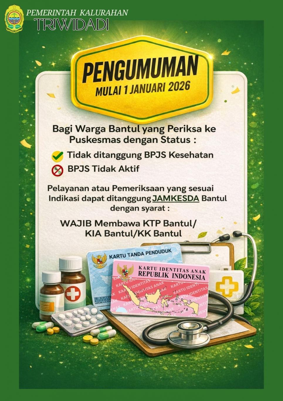 Triwidadi Info (03/02). Pemerintah Kabupaten Bantul menetapkan ketentuan pelayanan kesehatan bagi masyarakat yang melakukan pemeriksaan di Puskesmas dengan status kepesertaan BPJS Kesehatan tidak aktif atau tidak ditanggung BPJS. Kebijakan ini mulai berlaku pada 1 Januari 2026.