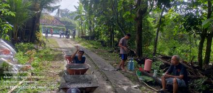 Pelaksanaan kegiatan dimulai pada tanggal 13 Februari 2026 dan direncanakan selesai pada 09 Maret 2026, dengan durasi pekerjaan selama 20 (dua puluh) hari. Volume pekerjaan tercatat sebesar 52,93 m³. Dalam pelaksanaannya, kegiatan ini melibatkan 26 tenaga kerja lokal yang terdiri dari 2 ketua kelompok, 4 tukang, dan 20 pekerja, dengan jumlah tenaga kerja rata-rata per hari sebanyak 26 orang. Adapun besaran upah tenaga kerja yang diberikan sesuai ketentuan program, yaitu Rp 90.000,- per hari untuk Ketua Kelompok, Rp 80.000,- per hari untuk Tukang, dan Rp 70.000,- per hari untuk Pekerja.