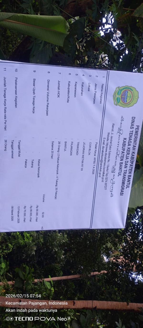 Triwidadi Info (15/02). Dinas Tenaga Kerja dan Transmigrasi Kabupaten Bantul melaksanakan kegiatan Padat Karya APBD Tahun Anggaran 2026 berupa pekerjaan cor blok yang berlokasi di Jojoran Wetan RT 03, Kalurahan Triwidadi, Kapanewon Pajangan, Kabupaten Bantul. Pada hari minggu, 15 februari 2026. Program ini merupakan bagian dari Padat Karya Infrastruktur yang bertujuan meningkatkan kualitas jalan lingkungan sekaligus memberikan kesempatan kerja kepada masyarakat setempat.