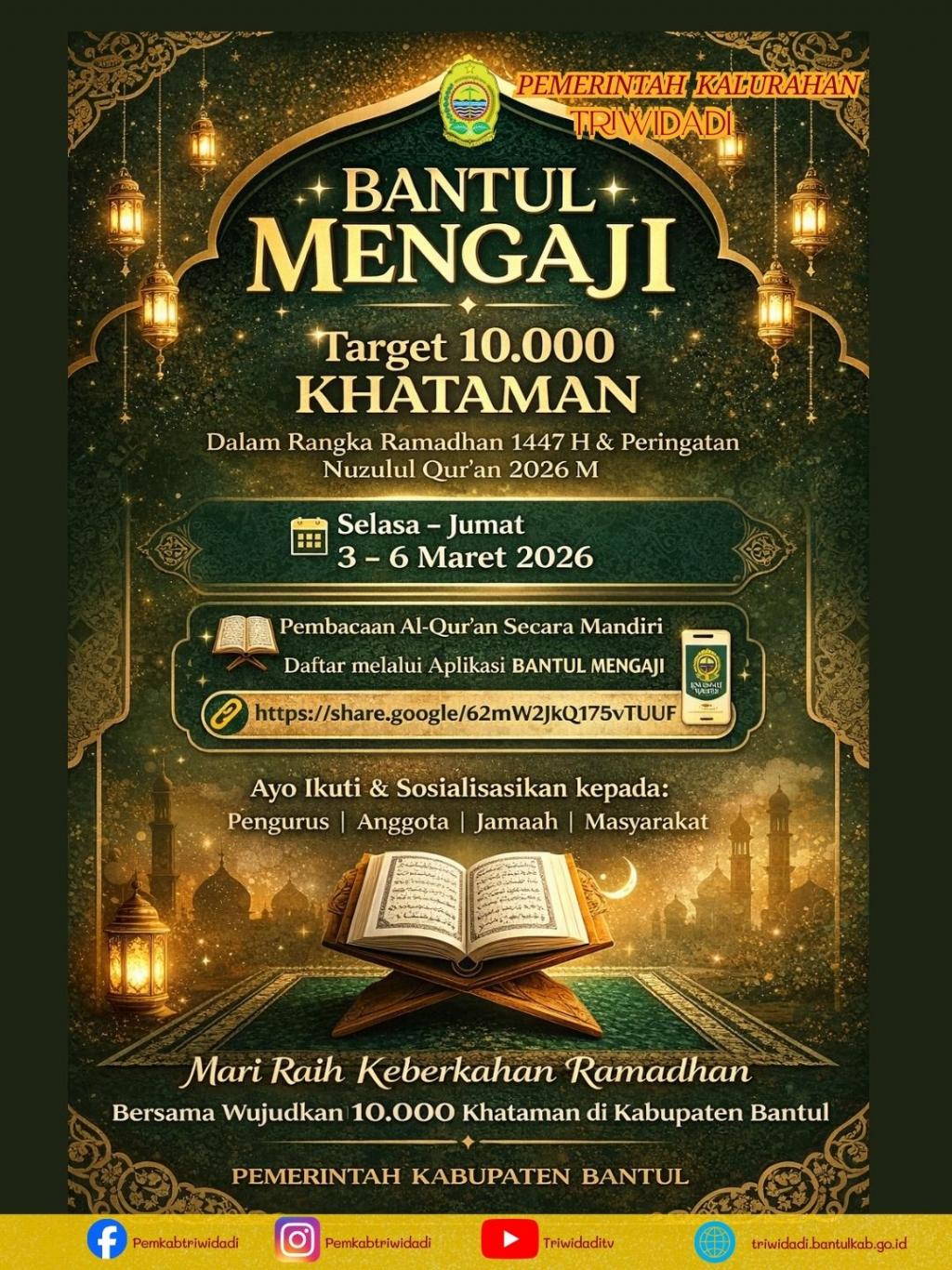 Triwidadi Info (04/03). Dalam rangka meningkatkan kualitas keagamaan masyarakat Kabupaten Bantul di bulan suci Ramadhan serta memperingati momentum Nuzulul Qur’an 1447 H / 2026 M, Pemerintah Kabupaten Bantul akan menyelenggarakan kegiatan BANTUL MENGAJI dengan target 10.000 khataman Al-Qur’an.