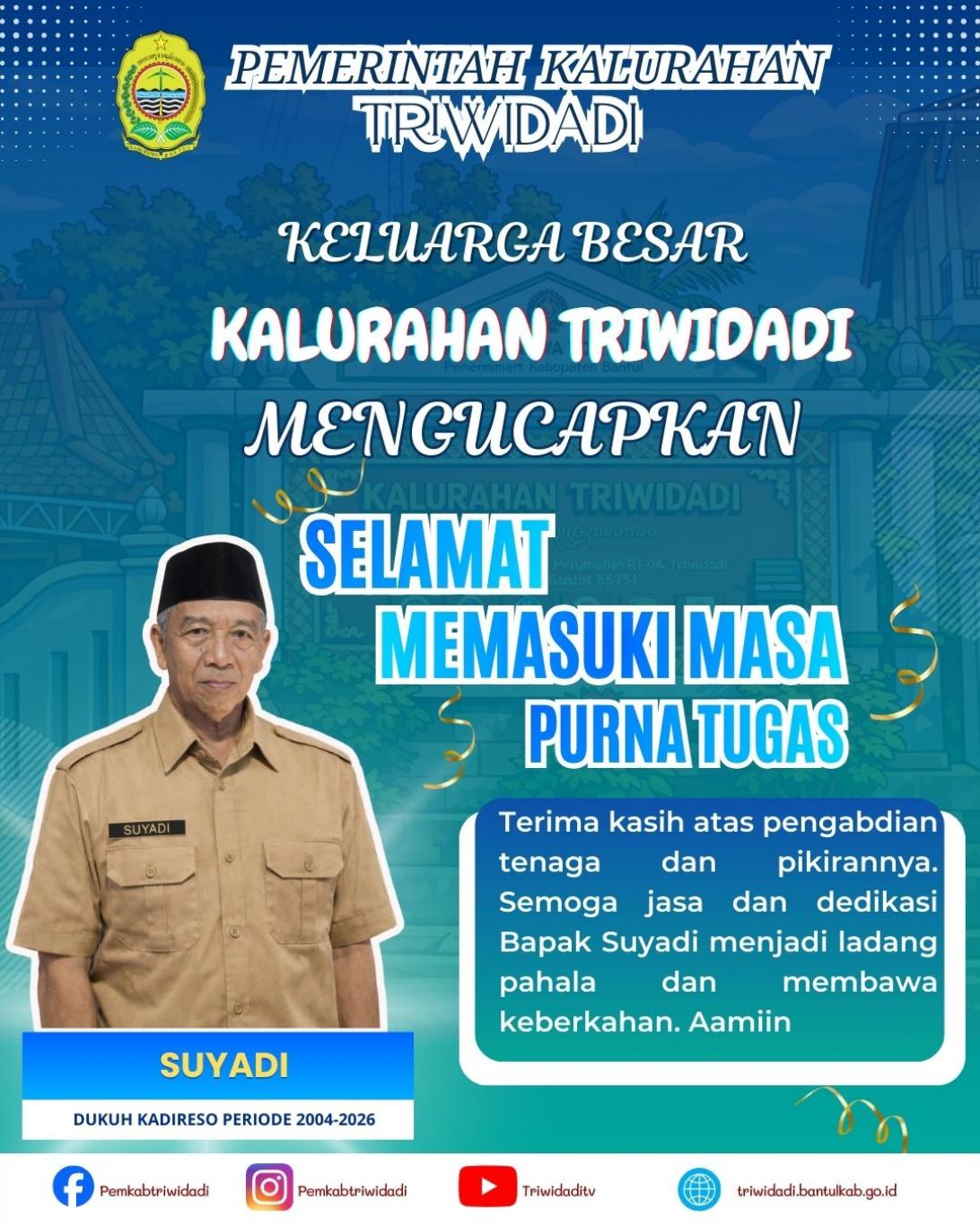 Triwidadi Info (07/03). Pemerintah Kalurahan Triwidadi, Kapanewon Pajangan, Kabupaten Bantul menyampaikan penghargaan dan ucapan terima kasih kepada Bapak Suyadi, Dukuh Kadireso, yang telah memasuki masa purna tugas setelah mengabdi selama kurang lebih 22 tahun, terhitung sejak tahun 2004 hingga 2026.